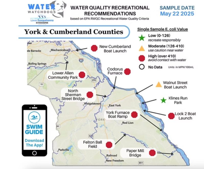 According to testing conducted at 20 different locations by the Lower Susquehanna Riverkeeper throughout the watershed, e. coli is found at levels above those considered safe under U.S. Environmental Protection Agency guidelines in many of those waterways. The testing is done weekly throughout the summer months, according to the riverkeeper association.