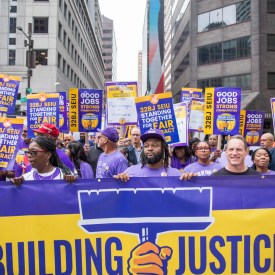 Thousands of commercial janitors and building workers from Service Employees International Union 32 BJ rallied in Philadelphia on Tuesday as the union’s contracts representing 70,000 workers on the East Coast are set to expire over the next few months