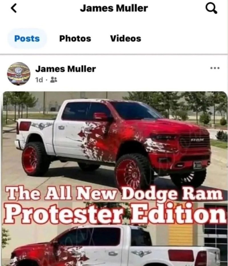 The photo was captioned “the All New Dodge Ram Protester Edition,” and appeared in the screenshot to be set to the “Friends Only” privacy setting.