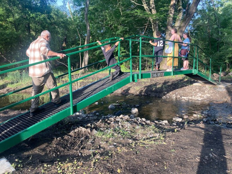 Ernie Grant III climbs the new footbridge in Vermilion Hills named for the late Craig Doster. Grant's father built the original and named it for Doster. Falls Township officials replaced the old span with a new one, dedicated on May 29, 2025.