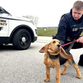 K-9 Sgt. Mason, a 12-week-old bloodhound, and his handler, Cpl. Rick Wolf, took part in their first official training session together last week at Morning Sun Marketplace in Jackson Township.