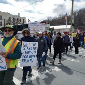 “We walk, we sing, we shout, no more kings,” was the signature chant for an estimated 405 protesters at Honesdale’s third No Kings rally on March 28.