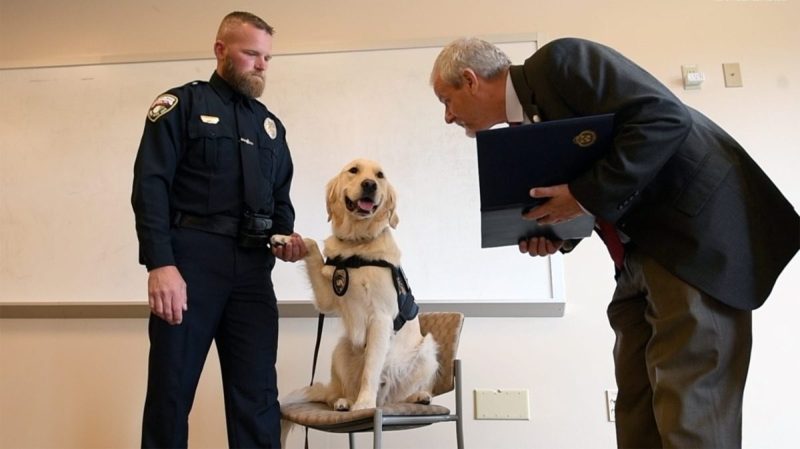 Sitting on a booster seat, with paw raised in the hand of his partner who helped him speak his part, Reacher was read the oath that accompanies the entry of every sworn officer into service, concluding with “I will discharge the duties of my office with fidelity as long as officer Hatterer continues to give me treats.”