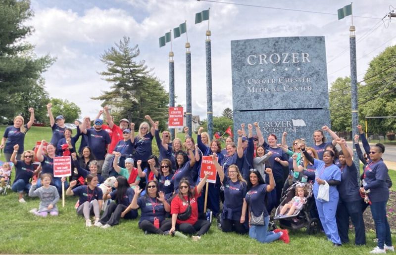 The Crozer-Chester Nurses Association and local lawmakers picket outside Crozer-Chester Medical Center in Upland, Pa., last May, to protest actions by the hospital’s owner, the for-profit chain Prospect Medical Holdings. Private equity firms have been buying up hospitals in recent years; cutbacks and closures sometimes follow. (Courtesy of the Pennsylvania Association of Staff Nurses and Professionals)