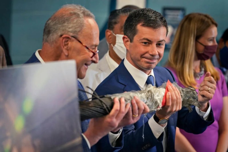 Secretary of Transportation Pete Buttigieg, right, and Sen. Chuck Schumer, D-N.Y., hold a decaying piece of a rail tunnel while they speak during a news conference in New York, Monday, June 28, 2021. Buttigieg toured the century-old rail tunnel connecting New York and New Jersey as a long-delayed project to build a new tunnel gains steam. (AP Photo/Seth Wenig)