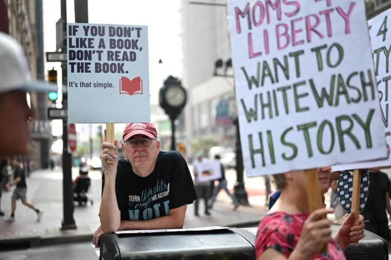 PHILADELPHIA, PA – JUNE 30: Protestors demonstrate outside the Moms for Liberty Convention on June 30, 2023 in Philadelphia, Pennsylvania. ACT UP Philly, Youth Communist League, and Grandparents for Truth and Defense of Democracy organized protests. (Photo by Mark Makela for The Washington Post via Getty Images)