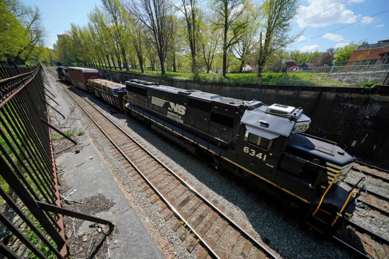 A Norfolk and Southern locomotive runs through the Northside of Pittsburgh on Monday, April 19, 2021. (AP Photo/Gene J. Puskar)