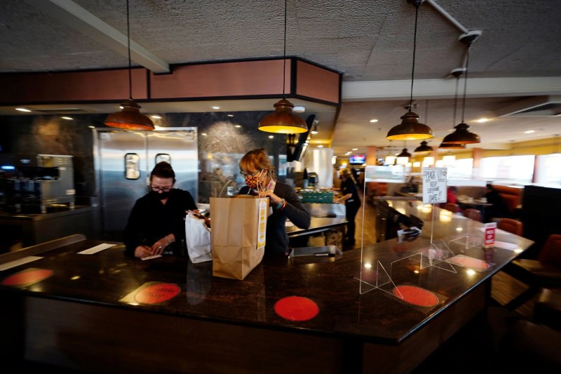 Managers Yllka Murati, left, and Cynthia Branche organize takeout orders at the Penrose Diner, Tuesday, Nov. 17, 2020, in South Philadelphia, just before the city ordered a halt to indoor dining. (AP Photo/Matt Slocum)