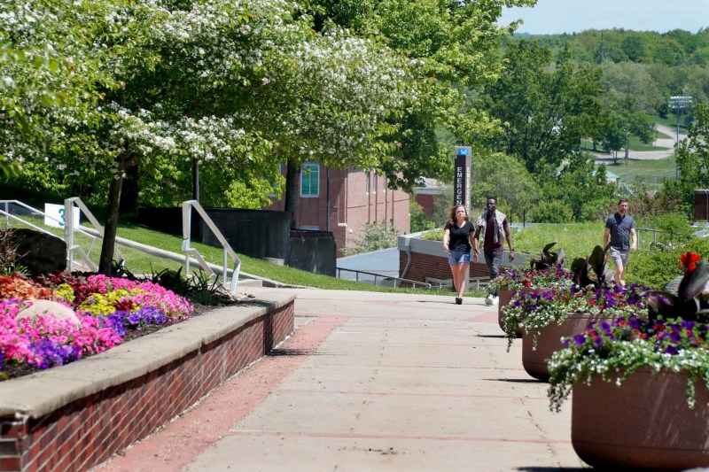 Visitors walk through the campus of Slippery Rock University in Slippery Rock, Butler County, in May 2019. (AP File Photo/Keith Srakocic)