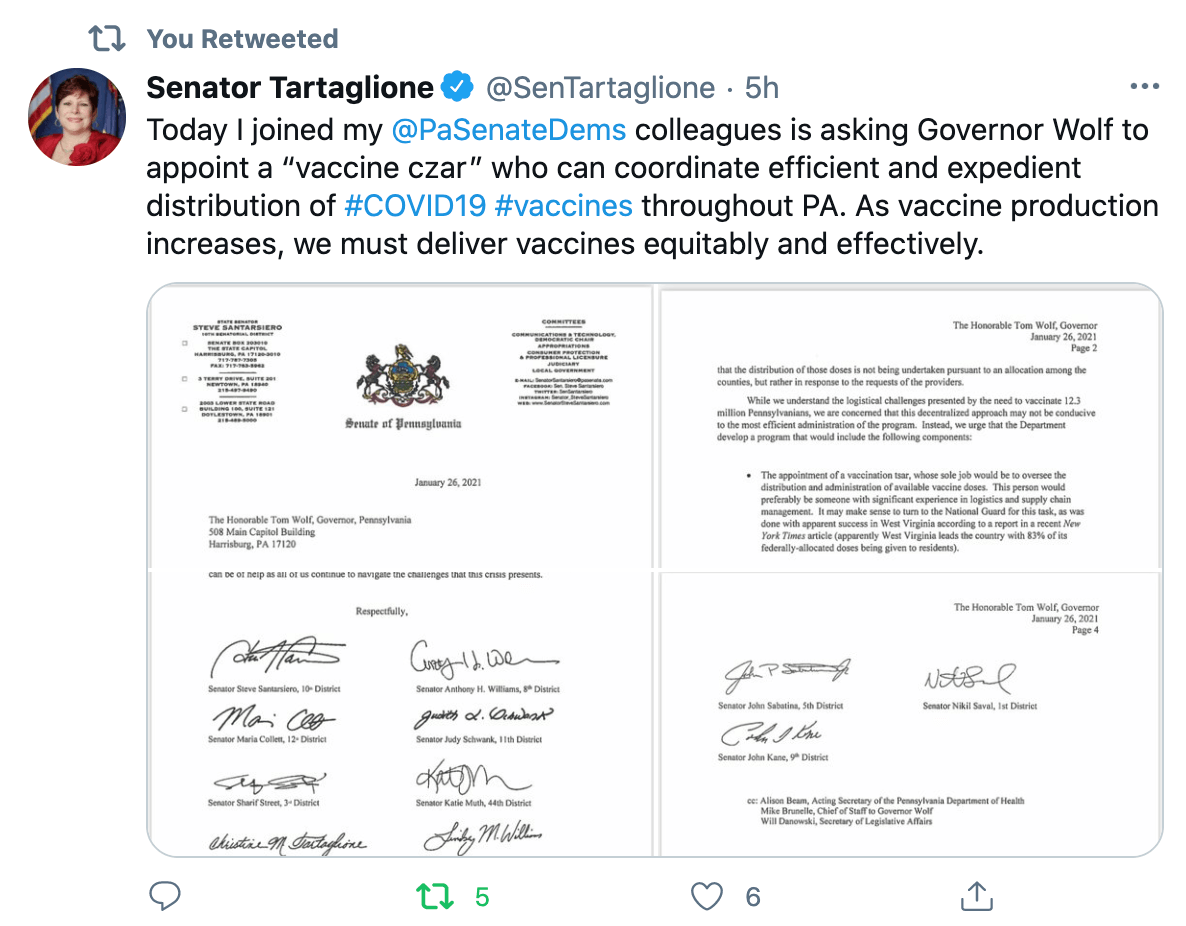 Fifteen state senators drafted a letter, dated Tuesday, to Wolf asking him to increase the state’s involvement in the distribution and administration of available vaccine doses. It is unclear whether the lawmakers sent the letter. State Sen. Christine Tartaglione posted the letter on Twitter and later deleted it.