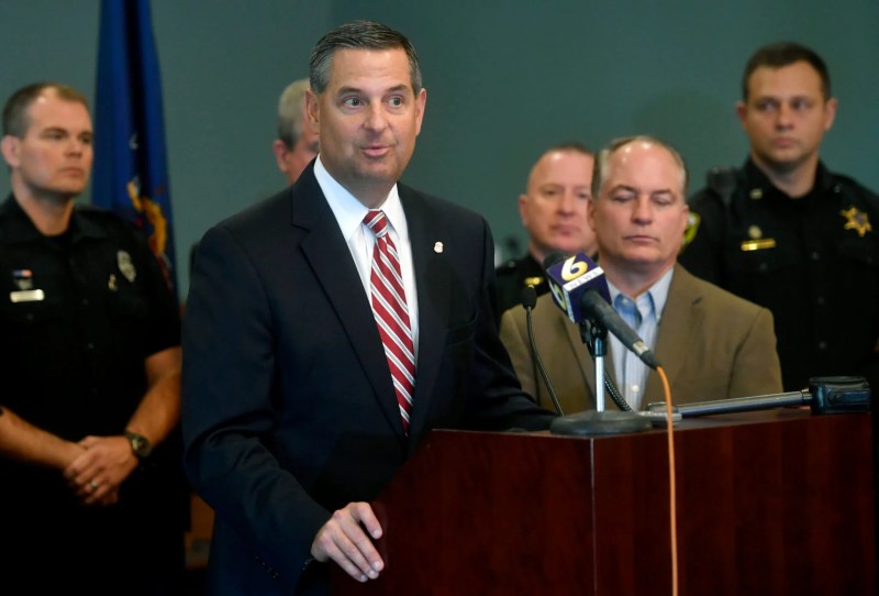 In this Oct. 19, 2018 file photo, US Attorney David Freed speaks at a news conference at the Centre County Courthouse Annex in Bellefonte, Pa. Freed's office issued a statement on Thursday, Sept. 24, 2020, that nine mailed-in military ballots had been "discarded" by the local election office. The announcement was seized on by President Donald Trump and his supporters. The US attorney's announcement of the investigation Thursday provided few details, but did mention the votes were for Trump. (Abby Drey/Centre Daily Times via AP, File)
