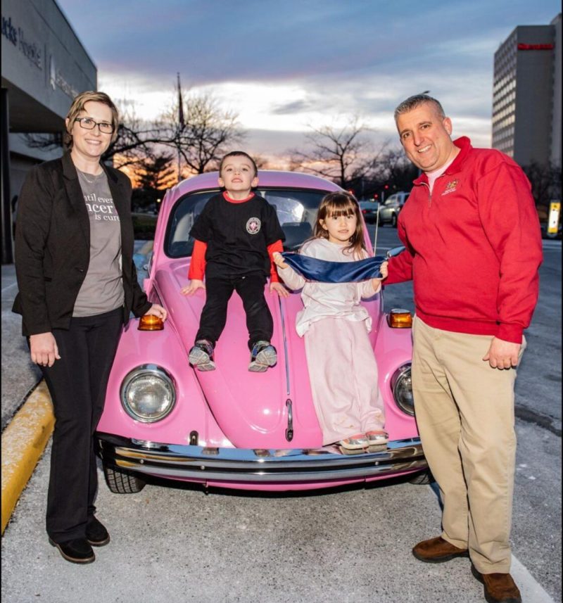 At Kristen’s last chemo treatment, Farry surprised his wife with her second ’73 bug — this one in pink.