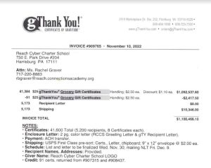 Screenshot of an invoice from REACH Cyber Charter School obtained by Education Voters of PA via a right to know request.