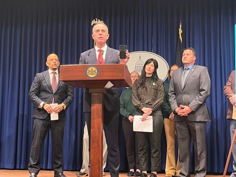 Sen. Steven Santarsiero (D-Bucks) holds a cell phone aloft at a press conference on Feb. 4, 2026. The former teacher said the devices are distractions for students in classrooms. (Photo by Whitney Downard/Pennsylvania Capital-Star)