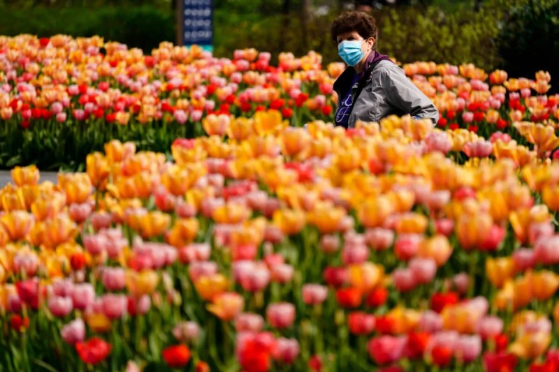 A person wearing a face mask as a precaution against COVID-19 walks between beds of tulips at Dilworth Park in Philadelphia, Wednesday, April 14, 2021. (AP Photo/Matt Rourke)