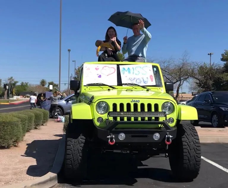 Art teacher Jenni Feidler goes all-out, painting her car for the caravan of love. They drive up and down the neighborhoods where their students live and wave to show how much they miss them.