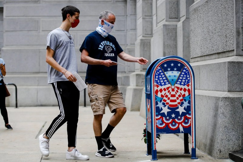 Benjamin Graff, center, and his son Jacob Graff, 19, drop off their mail-in ballots for the Pennsylvania primary election, in Philadelphia, June 2, 2020. (AP Photo/Matt Rourke)