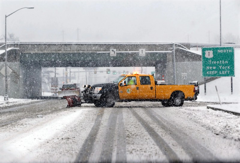A snow plow drives across a road in a heavy snowfall in Morrisville, Pa., early Tuesday, Dec. 10, 2013. Much of Pennsylvania got socked Tuesday with another snowstorm that closed schools, delayed flights and made travel difficult through parts of the state. The governor's budget address was among the events postponed. (AP Photo/Mel Evans)
