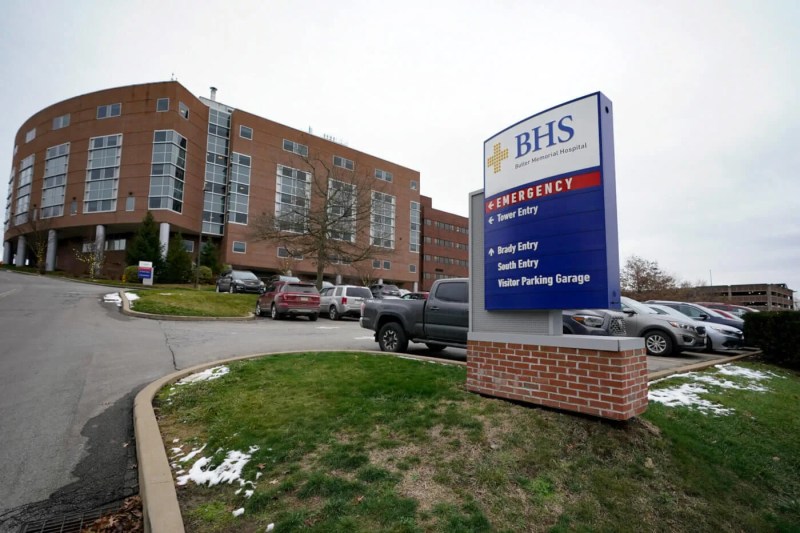 Signs mark the entrances and driveways to Butler Memorial Hospital, Friday, Dec. 4, 2020, in Butler, Pa. (AP Photo/Keith Srakocic)