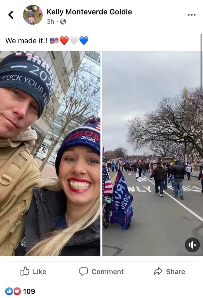 Officer Thomas Goldie was part of the initial rally, according to a public Facebook post shared by his wife; it is unclear if he participated in the attack on the Capitol.